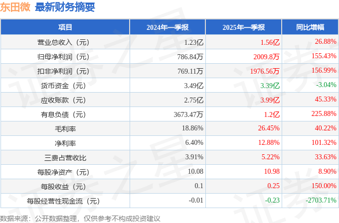 据证券之星公开数据整理,近期东田微(301183)发布2025年一季报。截至本报告期末,公司营业总收入1.56亿元,同比上升26.88%,归母净利润2009.8万元,同比上升155.43%。按单季度数据看,第一季度营业总收入1.56亿元,同比上升26.88%,第一季度归母净利润2009.8万元,同比上升155.43%。本报告期东田微应收账款上升,应收账款同比增幅达45.32%。
